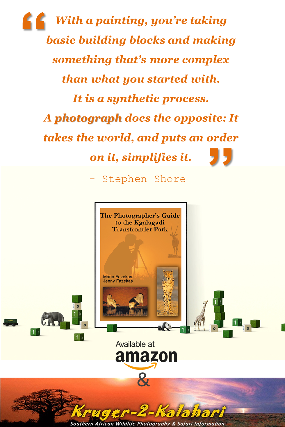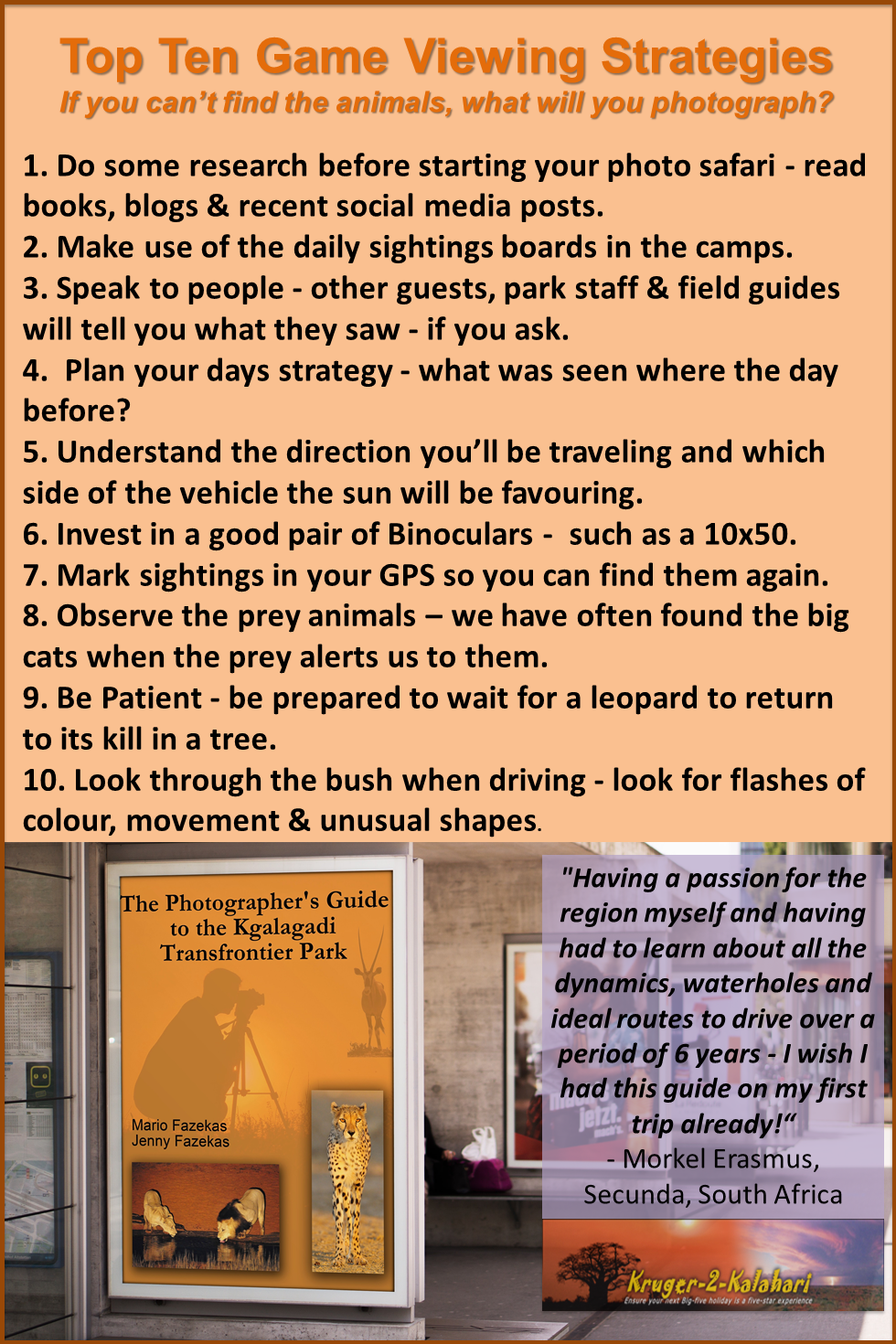 "We discovered Mario’s book, “Photographer’s Guide to Kgalagadi Transfrontier Park” online and a relative bought it for my birthday. This book was a godsend it saved us so much time in the park and gave such good advice re travel plans and photographic tips.