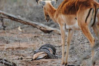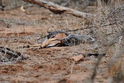 I was in Kruger 3 years ago, enjoying a cruise around the Satara area, when I saw an Impala, grunting at the ground. Looking closer I saw that there was a baby impala, being strangled by a snake, all right in front of me, just off to the side of the road.