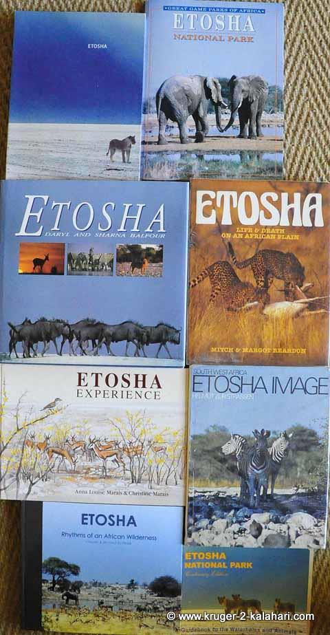 In Namibia the Etosha camp shops stock very little so I would suggest you stop off at 'Windhoeker Buchhandlung' in Windhoek, Namibia. They have a comprehensive selection of Etosha and other African Safari books.