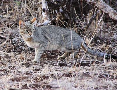Sherry and I were heading up the H10 first thing in the morning the second vehicle heading that way. I noticed the vehicle ahead of us narrowly miss the cat shown in the photos. Not sure if he saw it or just didn't care. We spent about 15 minutes photographing the animal before it finally disappeared into the bush. In that time a half a dozen cars passsed, but none appeared interested. I guess he wasn't big enough. This was the first time we had ever had a chance to photograph this species in daylight. We have seen one other and got some fair photos after dark in Sabi.