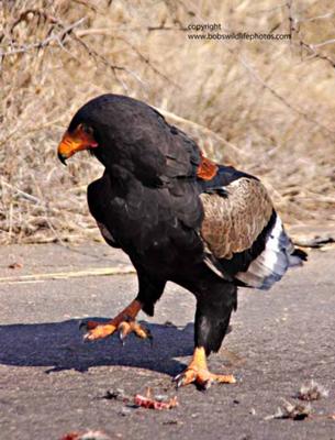 Sherry and I were driving up the the H10 and had just passed the Nkumbe view site thinking about breakfast at Tshokwane, when in the middle of the road was a Bateleur. Now we've taken lots of Bateleur photos, but none from less than 10 meters of a bird that basically just stood there. He had caught breakfast and was in the process of eating and didn't care about us at all. We spent several minutes photographing this dramatic bird then went on to our breakfast.