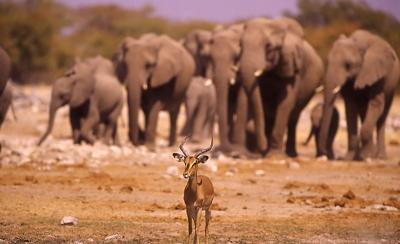 We were sitting at Goas waterhole and were watching an impala coming to drink. A herd of elephants started coming out the bush to the south so the imapala changed his course - then another herd appeared from the east - the imapala had to change course again and then a third herd appeared from the west literally surrounding the impala!