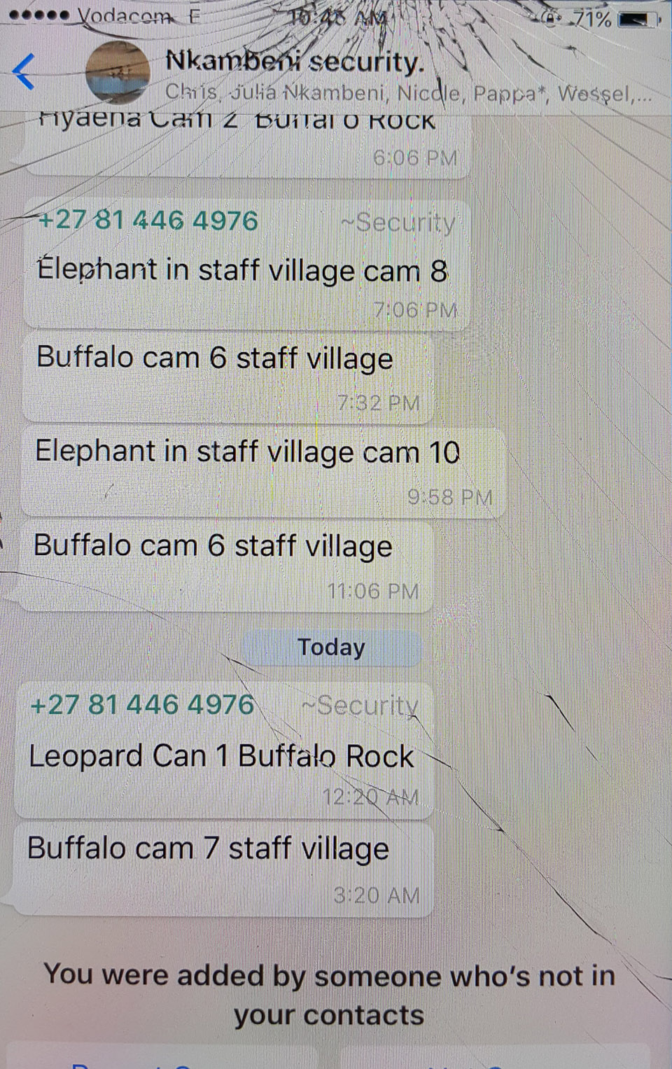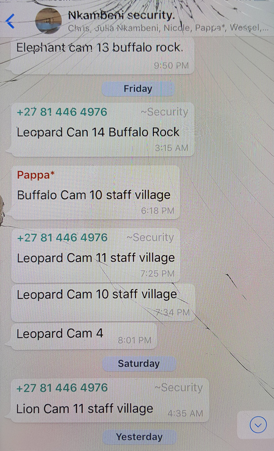 In case you're wondering what animals walk through Buffalo Rock Tented Camp and past Nkambeni Safari Camp, here are the notifications for the three days we were there: