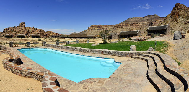 The lodge is built into the massive boulders, which can be seen at the back of the restaurant. The beautiful landscape round the lodge has large rocky outcrops forming a backdrop with a few quiver trees scattered here and there.