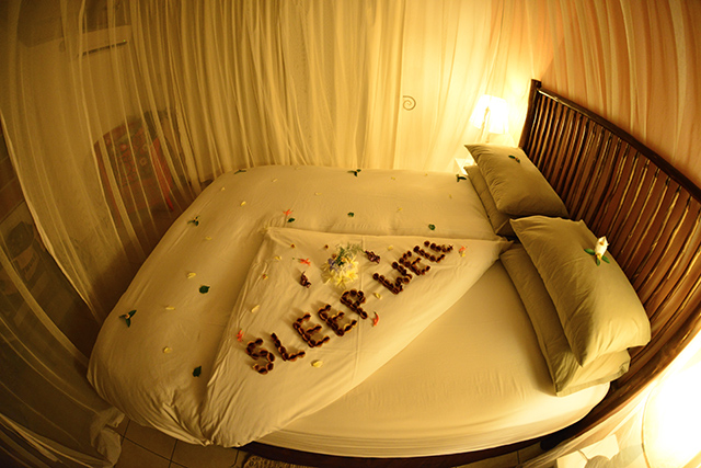 The ‘Sleep Well’ is made up of bushwillow pods and, in addition to the chocolates, there were flowers and petals scattered over the bed; it was truly a romantic setting.