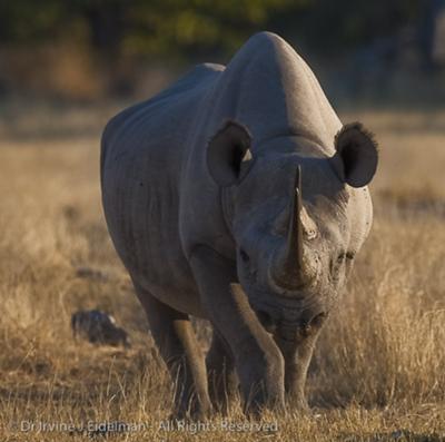 A Black Rhino heading our way at Goas waterhole at dusk.