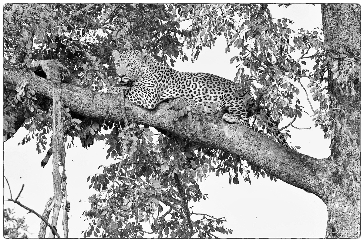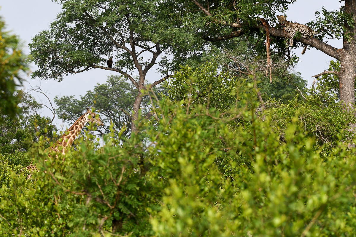 We looked back at the giraffe and they were still staring where they had been so we scanned and found a another leopard - in a tree with a kill!