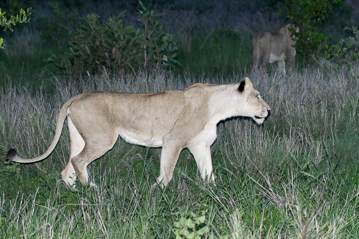 Lions x 6: male and female with cub at elephant carcass; 1 male in camp; 1 male walking; one male and then three females hunting at night and 1 female in the grass.