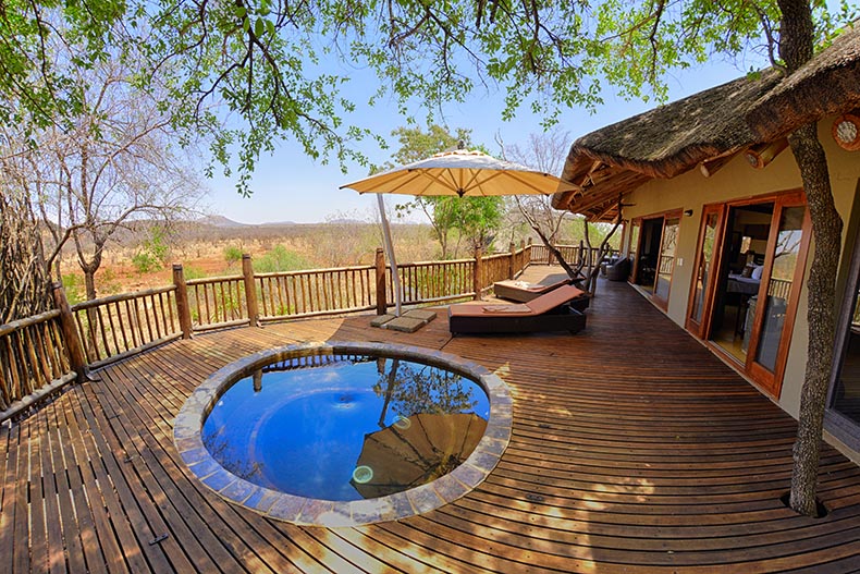 This stunning five star semi fenced lodge is perched on a small rocky outcrop overlooking a waterhole and surrounded by boulders and hills. It offers a great bush experience where nature, relaxation and luxury combine to form an unforgettable experience.