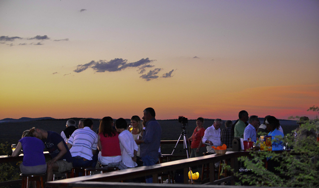 Cocktail hour is on the wooden viewing deck making it the ideal spot to sip sun-downers while watching the sun set and game drinking at the waterhole below.