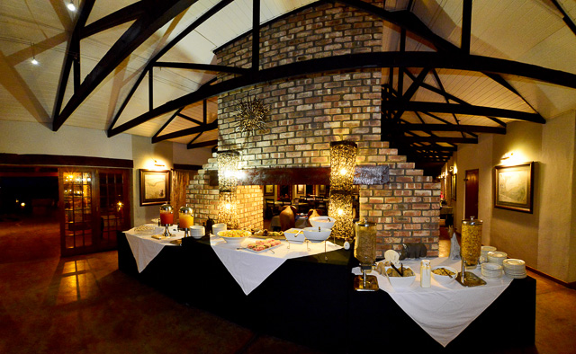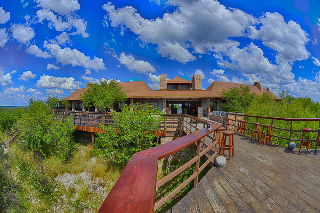 Just up a few steps is a large entrance with reception, curio shop and passage that leads into a huge dining room and onto a fantastic viewing deck that overlooks the savannah and waterhole below.