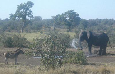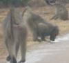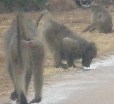 While traveling in the Kruger Park in June 2010, we saw this elephant and zebra quarreling around a waterhole and in July 2010 we came across these baboons drinking water from the road after a light drizzle.