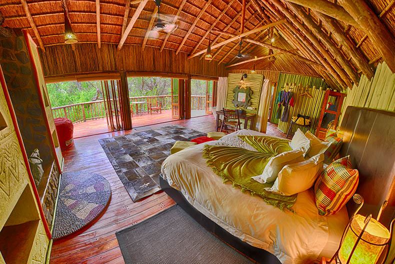 another view of the bedroom and deckNaledi Treehouse offers Jaci’s Tree Lodge guests the ultimate safari sleep-out under the stars, without even having to leave camp. Naledi – meaning Star in Tswana – is kitted out with a canopied King-size bed, private KolKol wood-fired hot tub, Enviroloo, outdoor shower and boasts exceptional watering hole views.