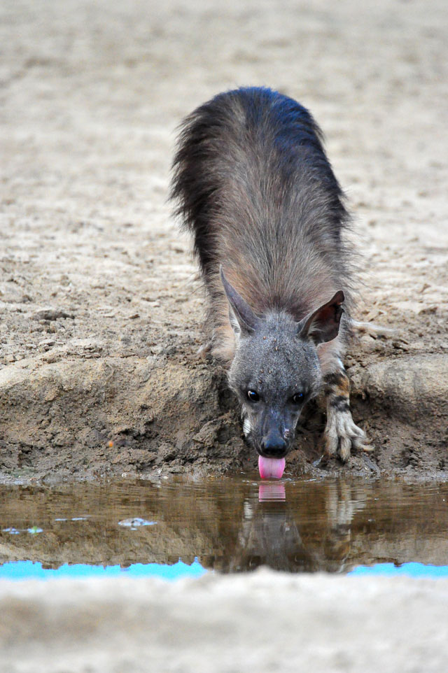 The next morning we left the lodge at the same time, but this time we went up north. We popped into Polentswa waterhole and found a brown hyena who had just finished drinking and the 2 Woolly-necked storks, the hyena was on his way, so we left and carried on northwards.