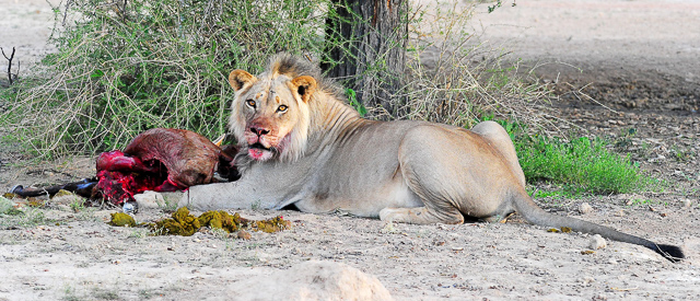 We arrived at Lijersdraai waterhole and at first glance could see nothing, then something near the reservoir moved and I saw it was a young male lion. It turned out that he was eating a Red Hartebeest that looked very fresh; I would say he had killed it in the early hours of the morning.