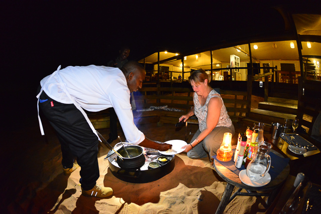 After Justin, the lodge manager, showed us round the newly furnished lodge we had our welcome drinks and we set off to our tent no 6 to unpack. That night we had dinner on the viewing deck overlooking the waterhole; it was a great dinner of Garlic Asparagus, grilled fish and veg then we ended the evening with fruit salad and ice cream.