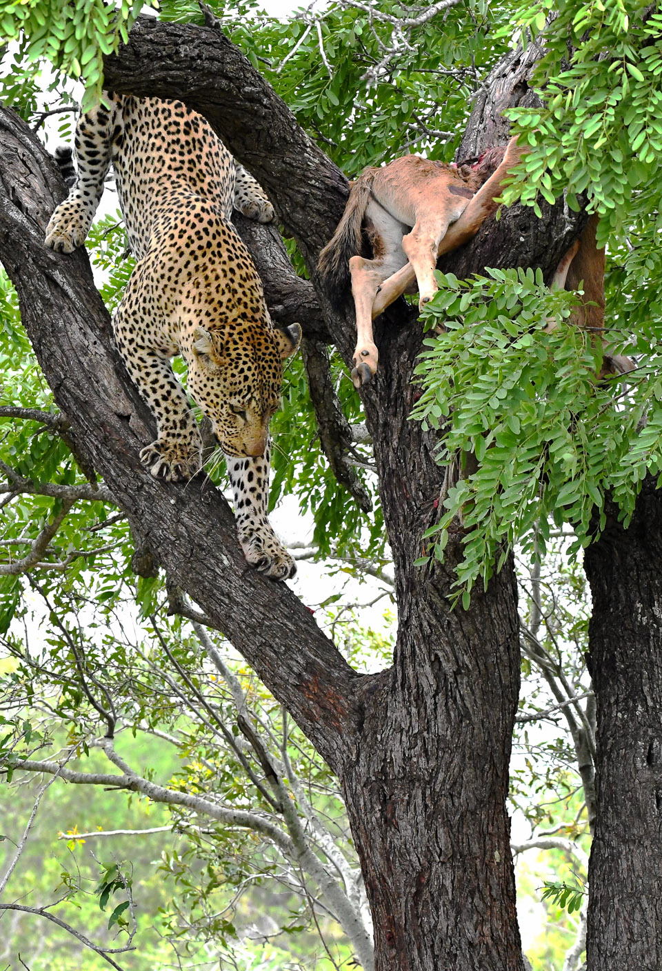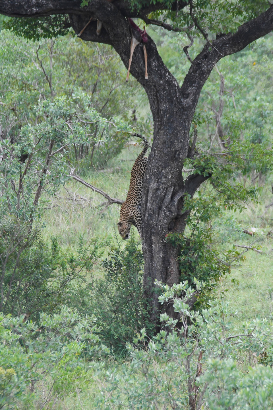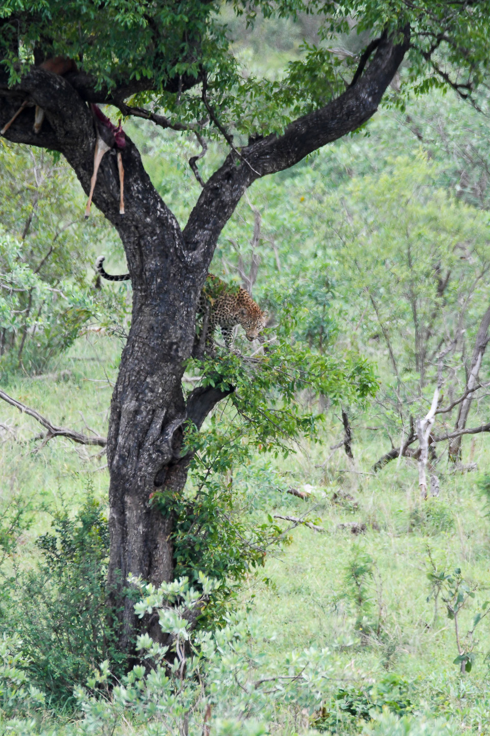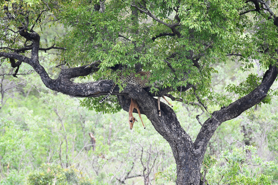 We spotted a leopard high up in a tree - most people photographed what you see here - impala legs hanging down and just a hint of a leopard...