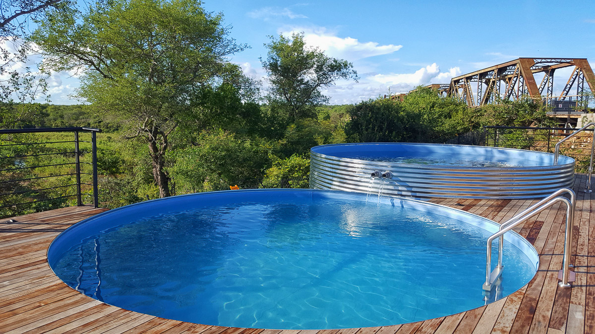 High above the riverbanks, aligned with the floor level of the train, lies the beautifully designed deck with pool that offers a swimming experience unlike any other – with crocodiles, hippos, buffalos and elephants to greet guests’ meters below...