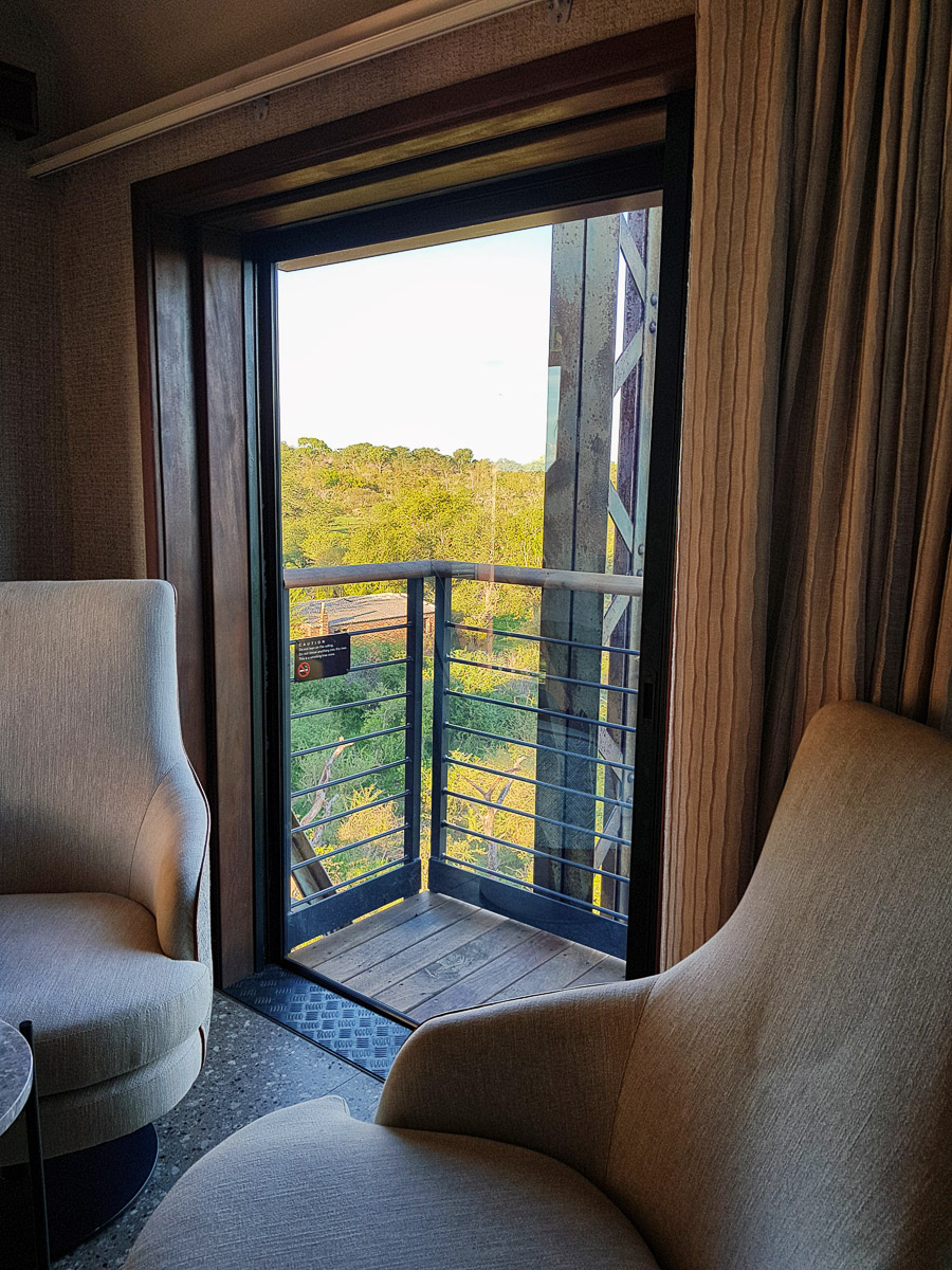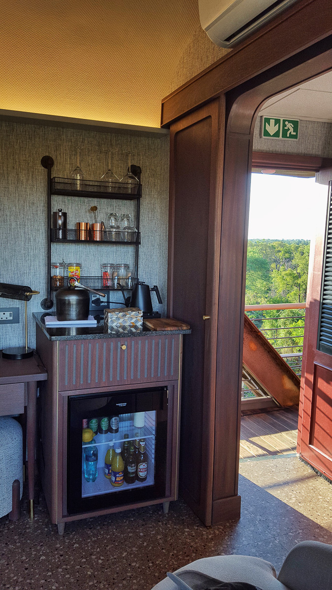 Each carriage is equipped with a fully stocked mini bar, tea and coffee station with snacks, a small seating area; glass doors open out onto a small Juliet balcony that overlooks the river and surrounding bush.