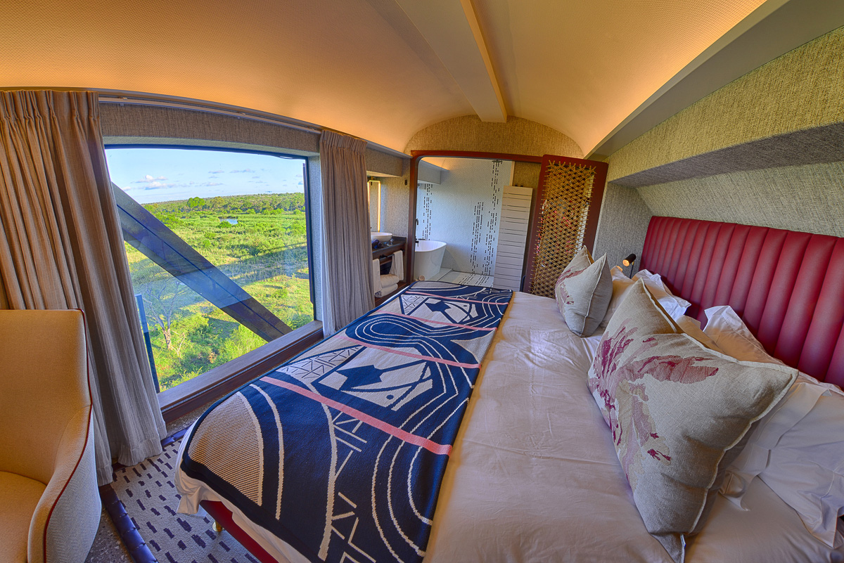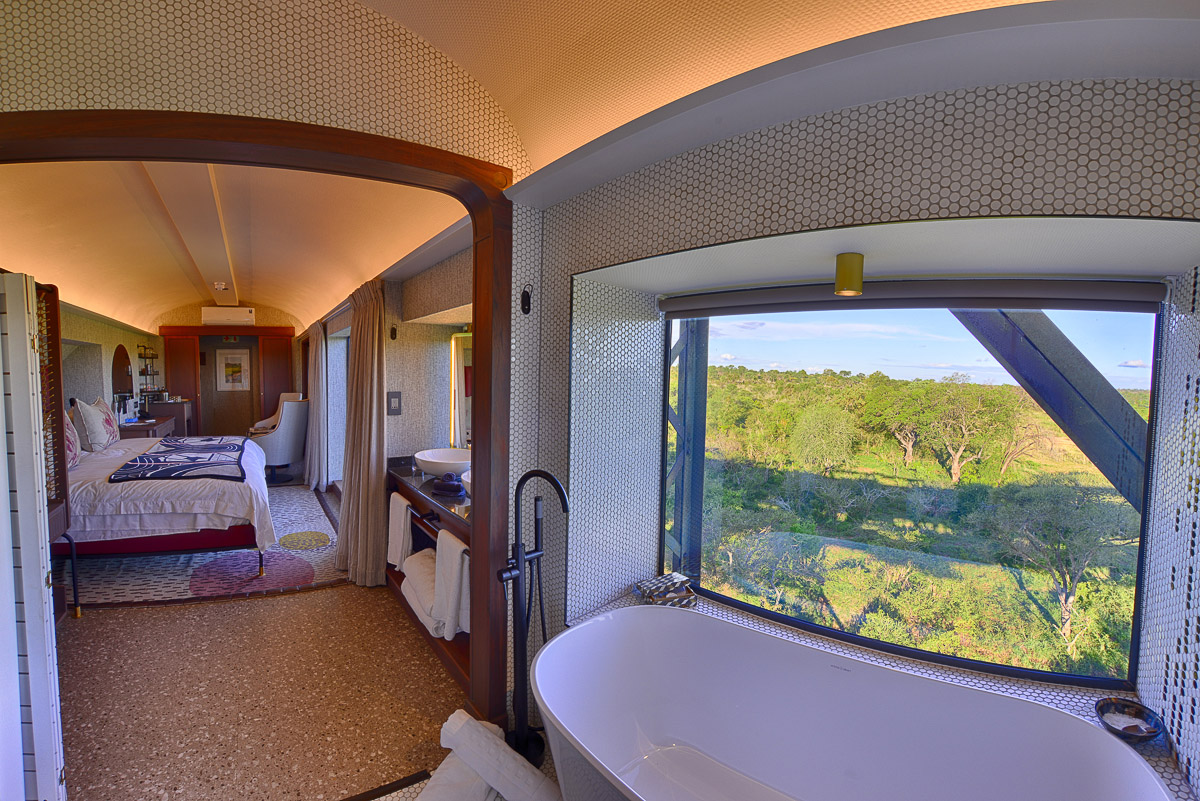 The glass-walled, large train carriage rooms allow for infinite views along the length of the majestic Sabie River while the style of the train is a celebration of African design in collaboration with local art and crafting skills.