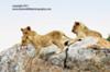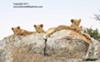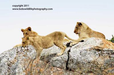 Sherry and I were driving south on the H10 about 1K past the Nkumbe lookout when Sherry noticed a group of lions on some rocks quite a ways out. She took the first shot with a 300mm lens. the remainder were shot with a 600 and a 1.4 extender and then cropped and lightend slightly. The scene itself was like out of a movie. If you look closely in the first shot you can see a babysitter on the right rock. The light was poor, but I couldn't resist taking a number of shots. The last shot while the rocks and lions are true, the background I edited in to produce a very neat image. Whenever we manipulated an image we will always let you know, both here and on our web site.