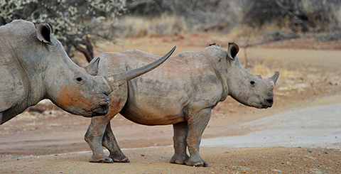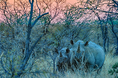 But it was just the warm-up to what we saw just an hour later. As the sun was setting we spotted two black rhinos, a mother and her calf. We got a little closer to see if we could get a better angle to photograph them and that’s when she charged us, stopping just inches away from the vehicle.
