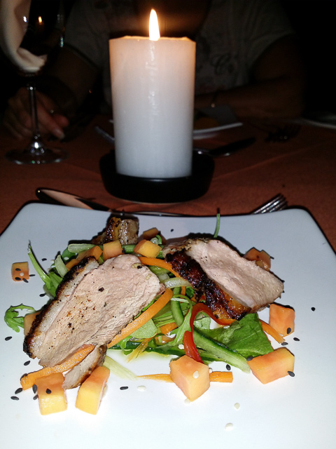 swimming pool at night with floating candle, ready for dinner guesthere is the roast duck-breast with citrus...