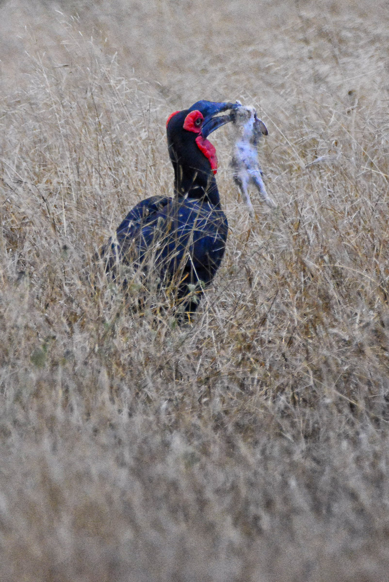 Rhino, elephant and hippo but the highlight was two ground horn-bills, one of which had caught a scrub hare and was proudly displaying his meal...! This was a first for us.