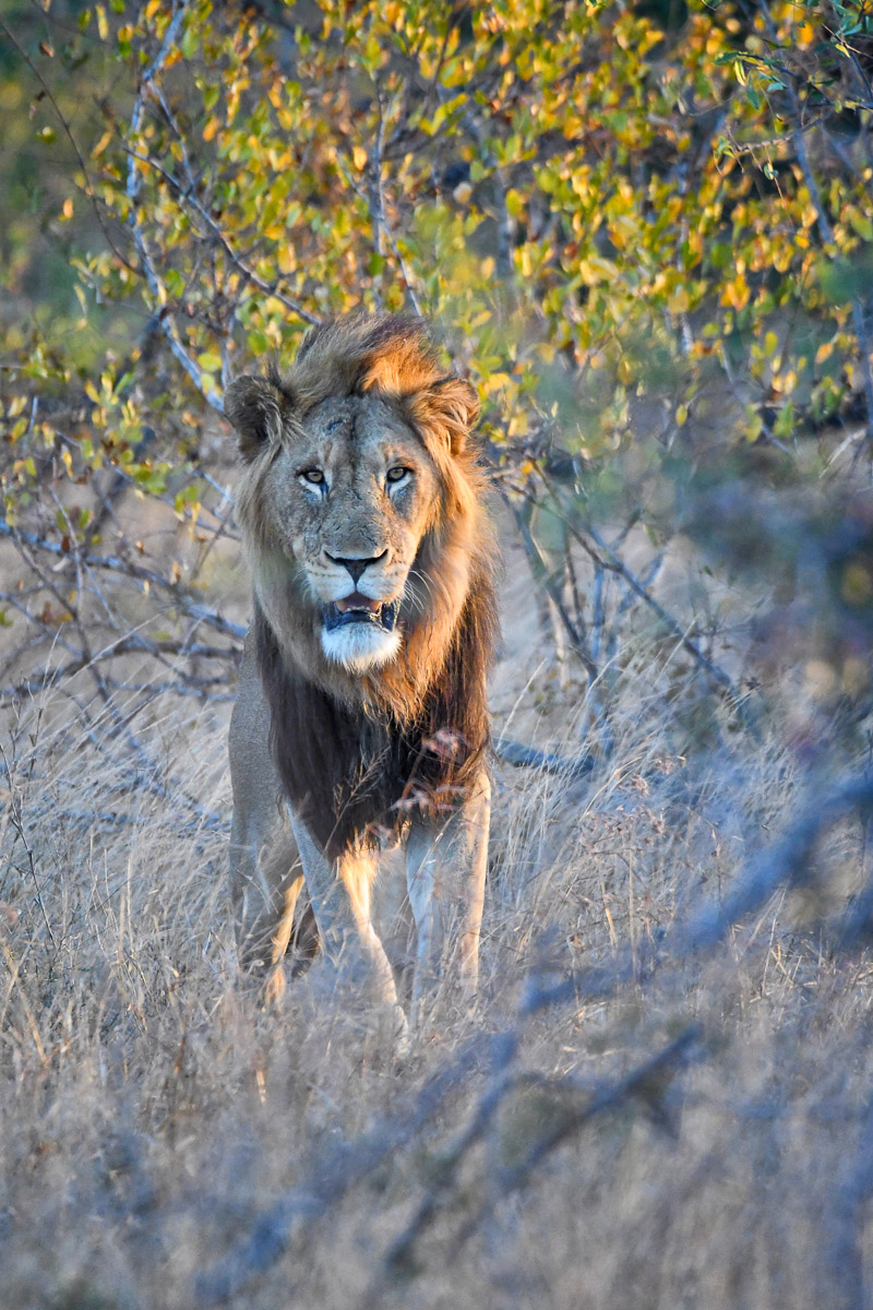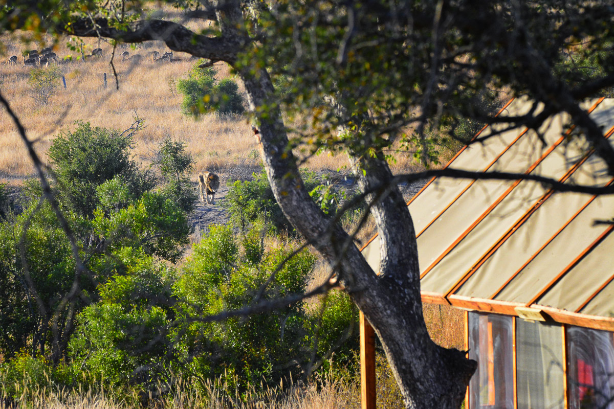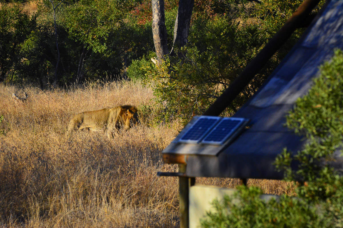 Morning Drive: This was our last morning drive but I was sick so I stayed behind at the camp. I went and sat up on the viewing tower to scan because the impalas were alarm calling, but I could not see anything. I then went back to my tent to fetch something and as I walked onto our deck, I saw a male lion walking towards camp.