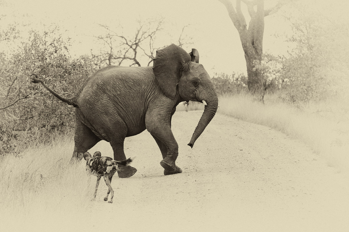 then wild dogs interacting with an elephant in the road
