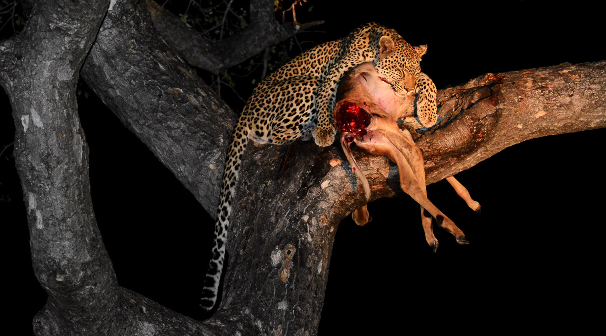 Our field guide called the sighting in and tells the field guide from one of the other up-market lodges that the leopard is hunting and is hiding in the road waiting to ambush the impala and we had switched off our lights so that the impala would not spot her and he should also switch off his lights. The other field guide agrees.