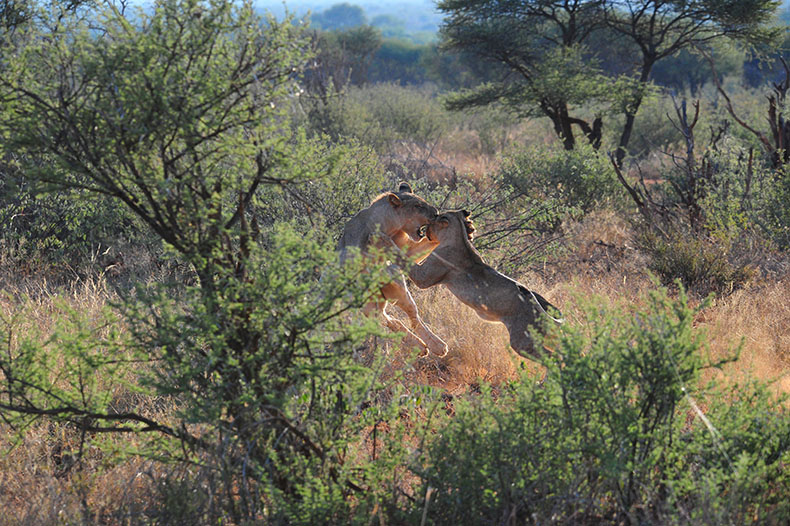It was two lion cubs and we started to follow them - the sun was rising behind them and they started playing, kicking up dust while back-lit – this was going to provide awesome photographs – or not.