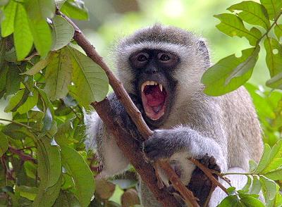 There are a few troops of vervet monkeys that pass through Skukuza camp. Sometimes we see them fighting or challenging each other, other time we see them raiding fridges or garbage bins while other times they challenge us, like this one is doing!