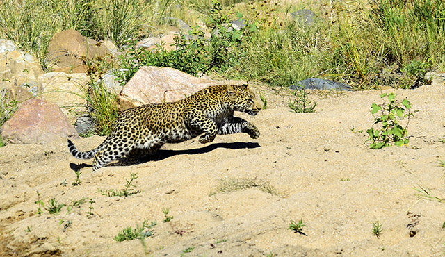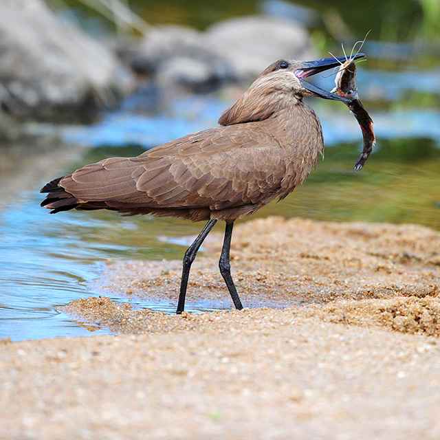 While watching the Hammerkop we caught movement in the reeds and saw a leopard that proceeded to stalk impala and a kudu that had come to drink from the water pools in the riverbed!