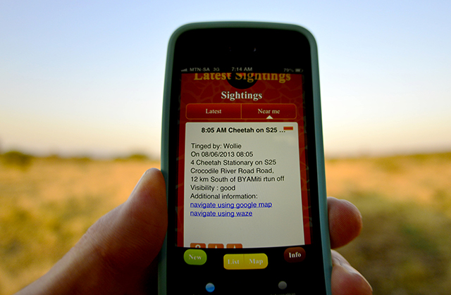 We entered Malelane Gate at about 07h30 on the Saturday and checked the previous day’s sightings at the gate and saw that there were lion (red) and leopard (black) sightings on the S25 Crocodile River road plus a cheetah (white) on the S114...