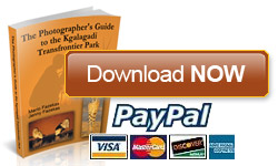 PS: We are confident that The Photographers Guide to the Kgalagadi Transfrontier Park eBook will be a huge help to you, but should you really disagree, then we will refund you immediately. Your satisfaction is guaranteed. If at any time within 30 days from buying this eBook you decide that you made a mistake, that the photographers guide to the Kgalagadi is not what you expected, then just email me and we will return your money instantly, no questions asked.