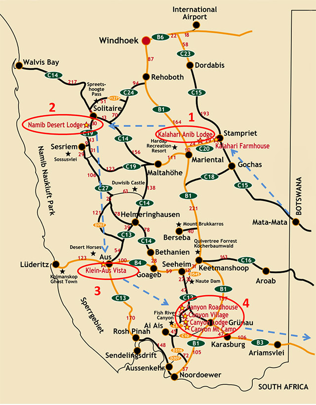 You could of course do the trip the other way around and start from Canyon Lodge if you are coming from Cape Town - you would then enter Namibia at the Noordoewer border post instead of Mata Mata or you could do any other combination of lodges and sights to suit your schedule. This is just a suggestion and worked great for us being nature photographers.