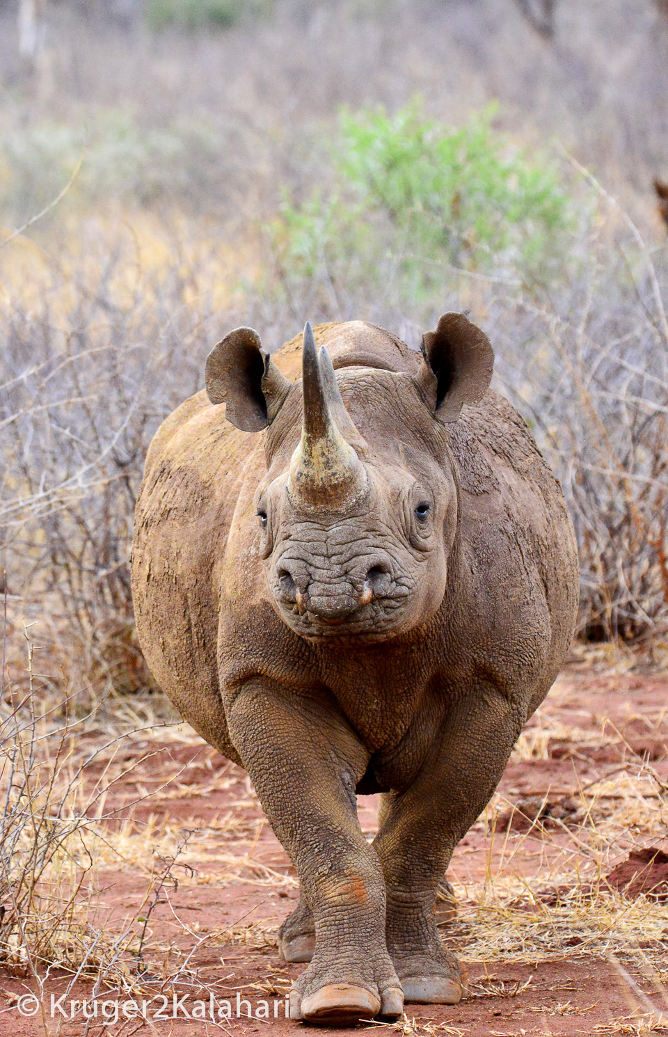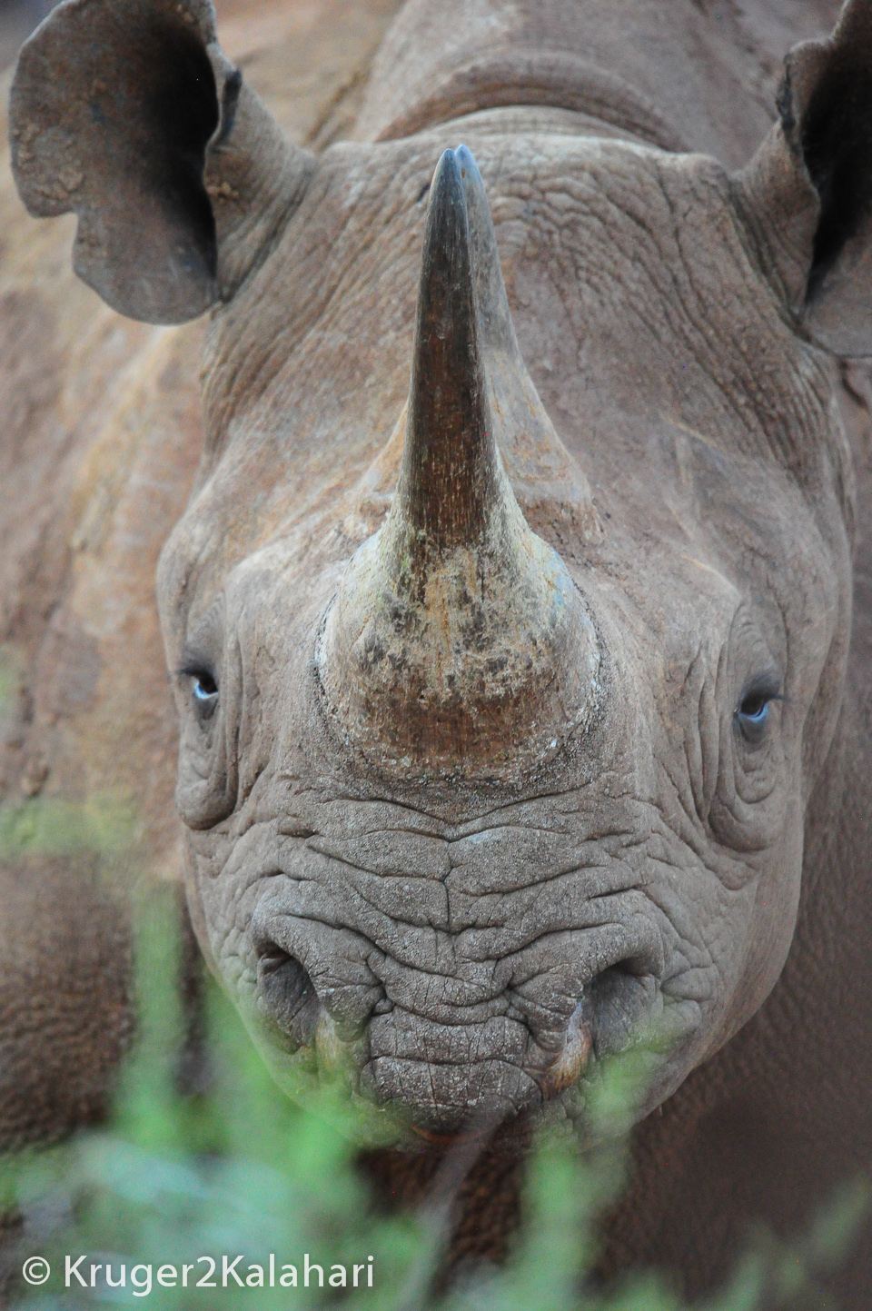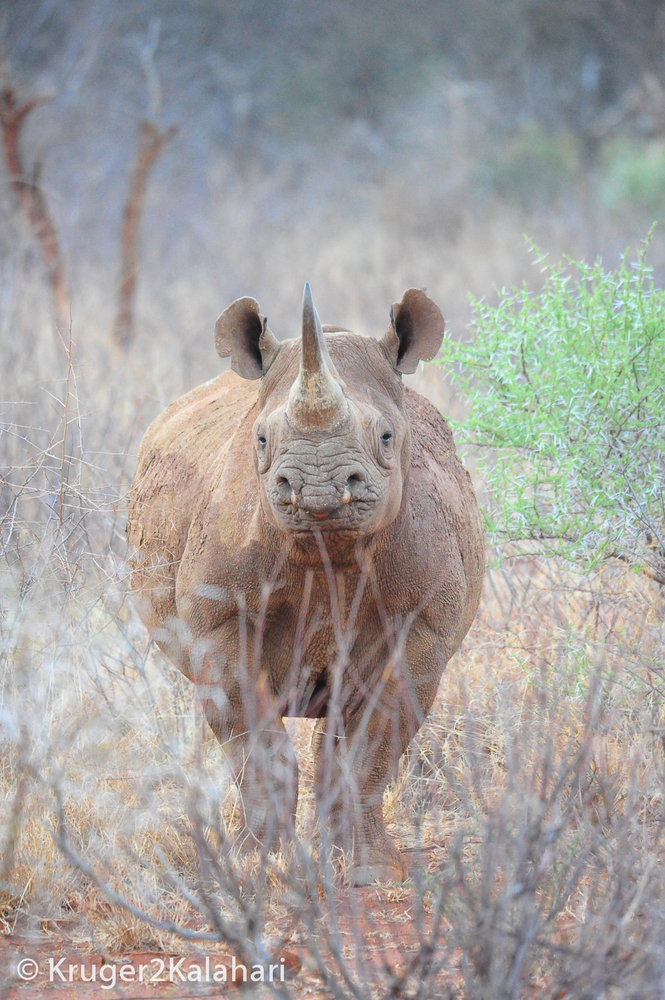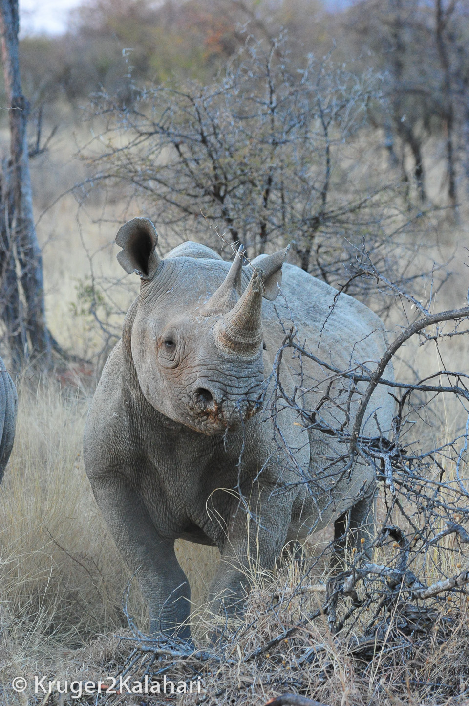 The Black rhino is either aggressive or inquisitive and we have experienced both, once in the Kruger we were charged by a mother with a calf near Lower Sabie and in the Pilanesberg we had a black rhino walk right up to our vehicle and sniff us.