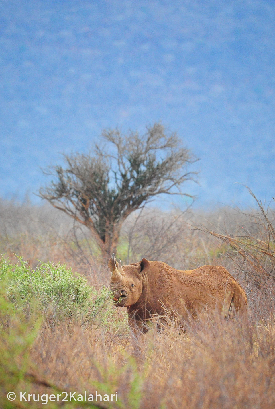 Finding a browsing black rhino and getting a photograph of it is an accomplishment because they are difficult to find in the bush. Black rhinos are found in densely wooded areas or where there are thick shrubs, while the white rhino is easily seen in the open grassy areas.