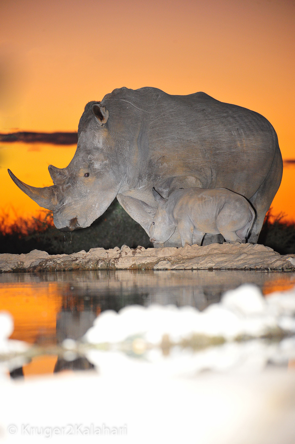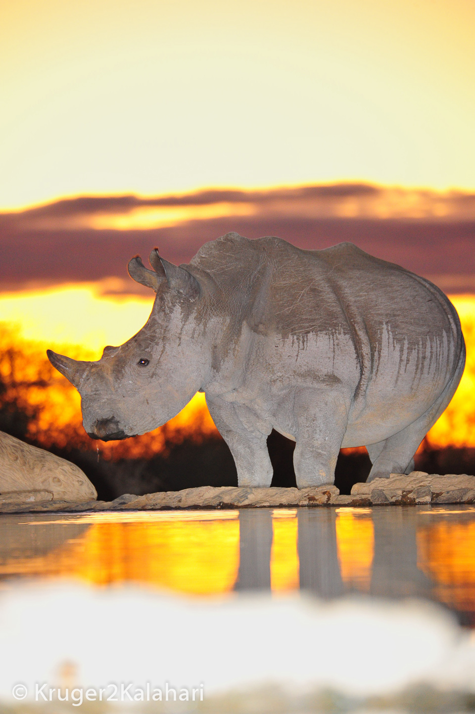 Rhinos drinking make great photographic subjects because you can get reflections of the animal, color in the water from the setting sun or water spilling out of their mouths as they drink.