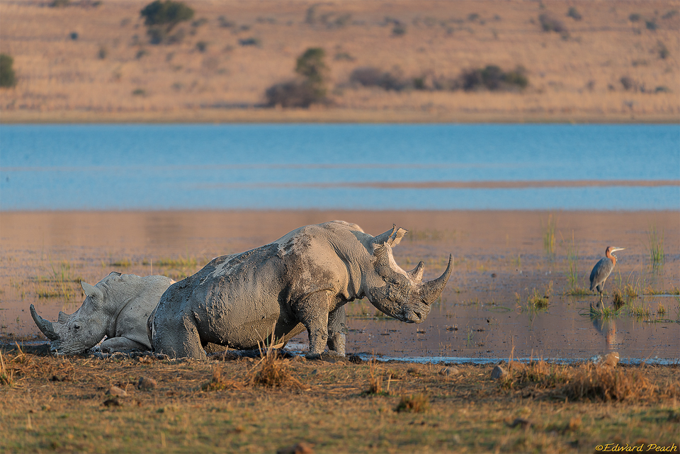 Both White and Black rhino can be found sleeping during the heat of the day normally in a cool place under trees or shrubs. They also love wallowing in mud and this is a great time to take photographs when they are calm and enjoying a cool mud wallow.