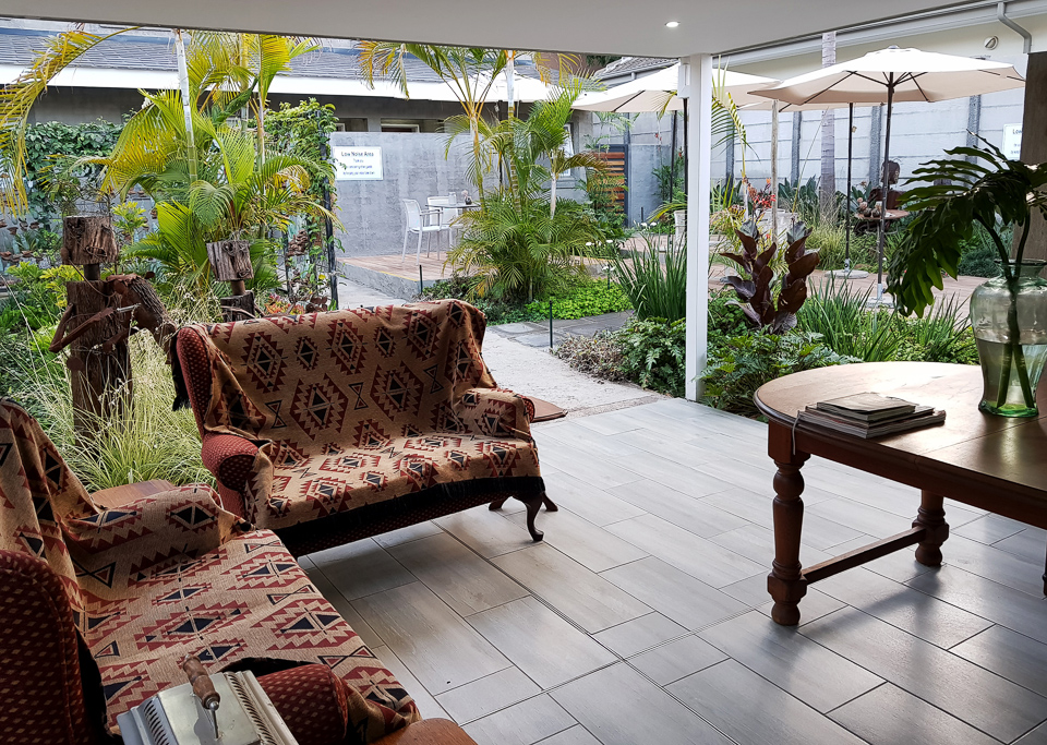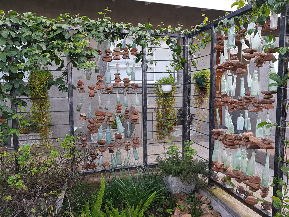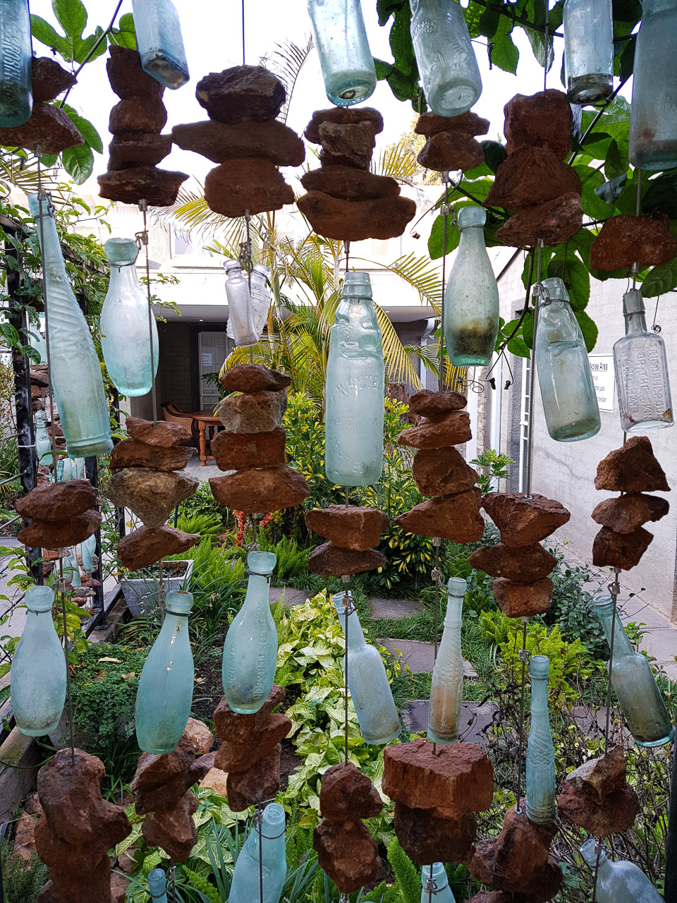 The décor is unique with old bottles and rocks used as screens in the gardens...