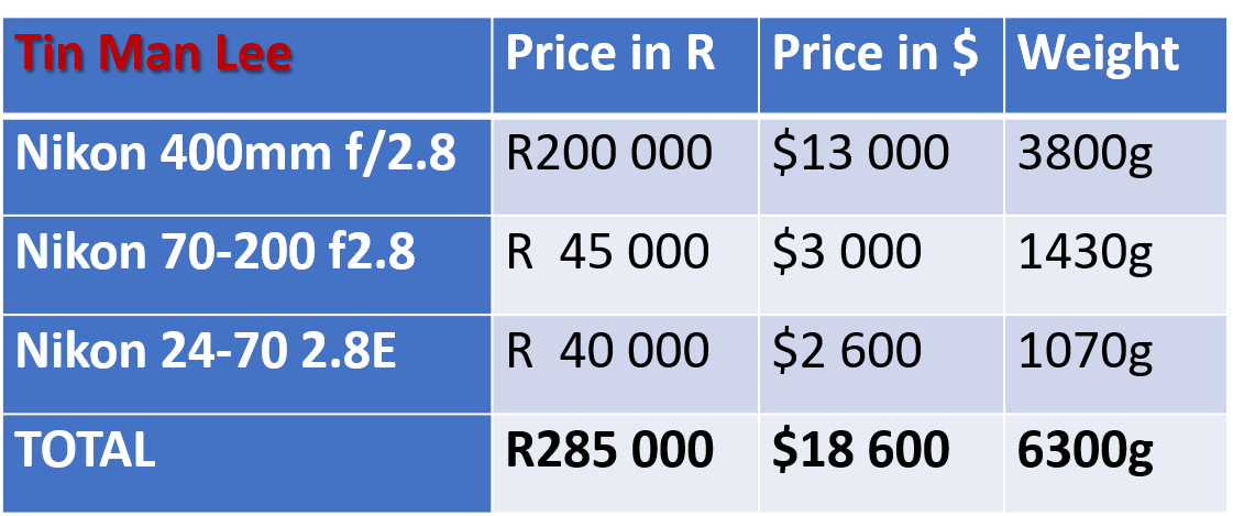 1. In the first article he recommends the Nikon 400mm f/2.8 FL VR. This lens costs R200 000,00 and weighs 3800g. You can read Tin Man’s review here.