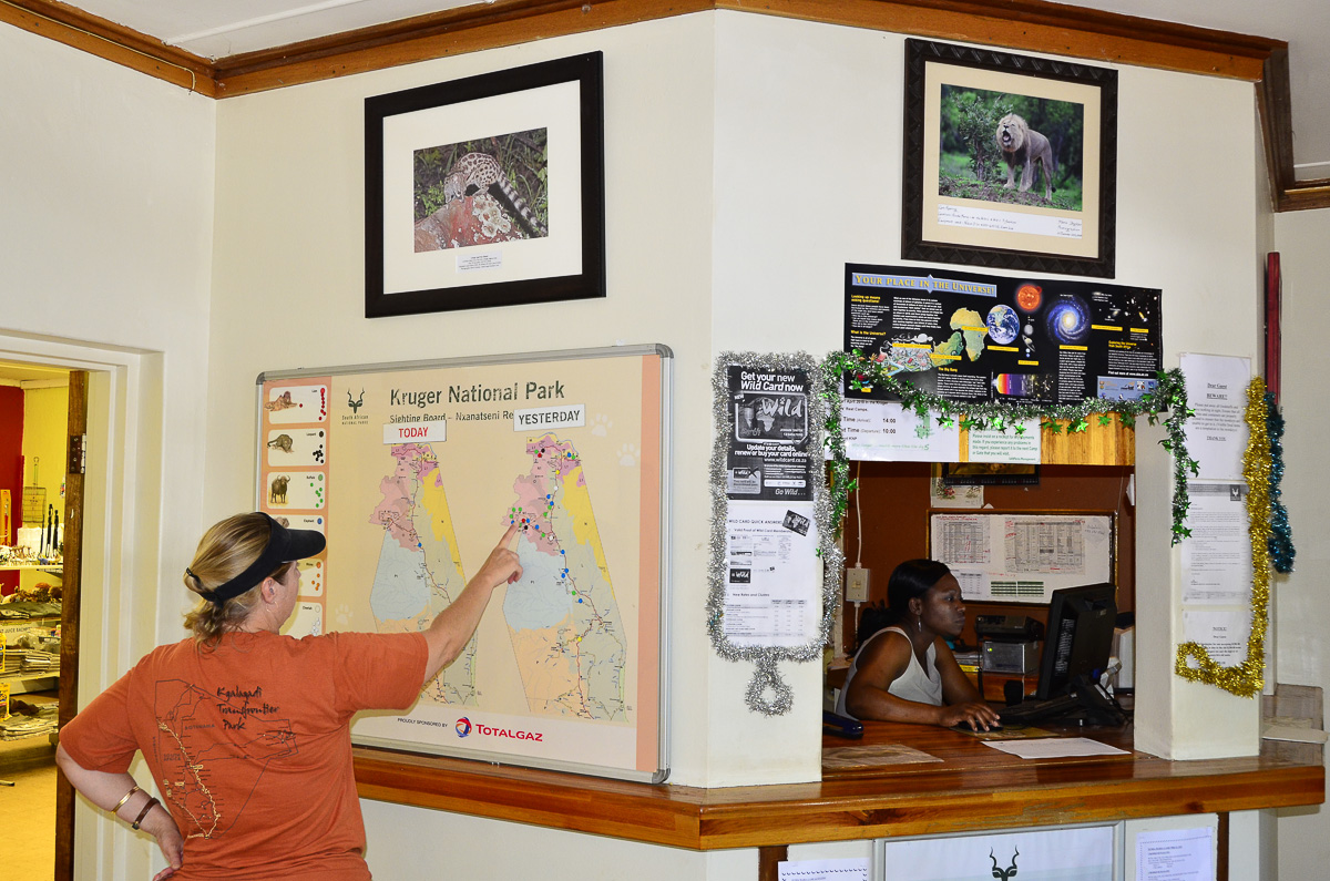 Punda Maria reception area and sighting board next to the shop. (Those are our photos of the lion and genet above the reception hatch).