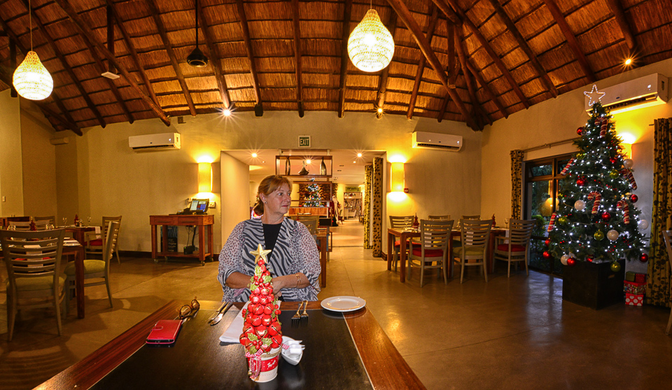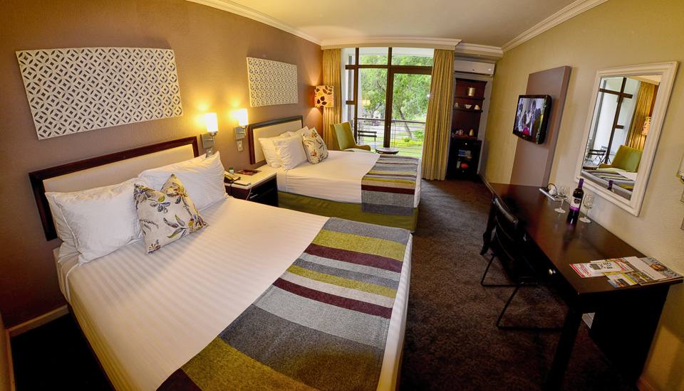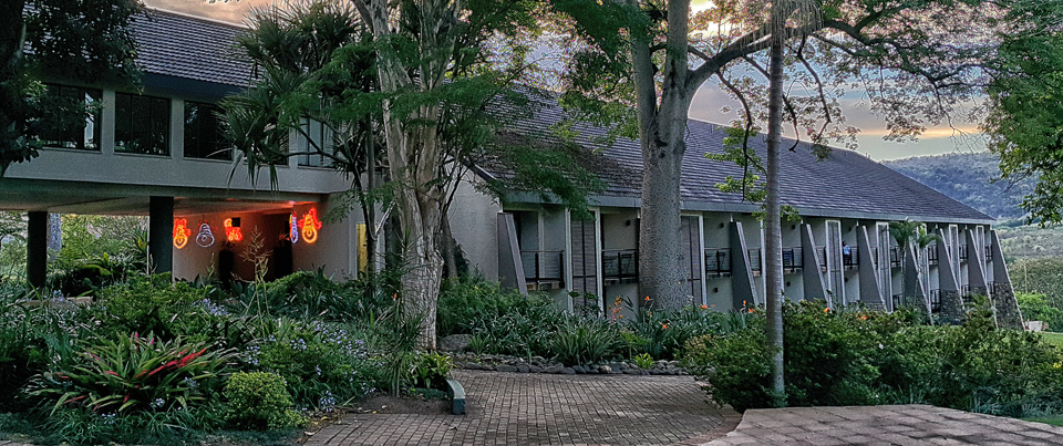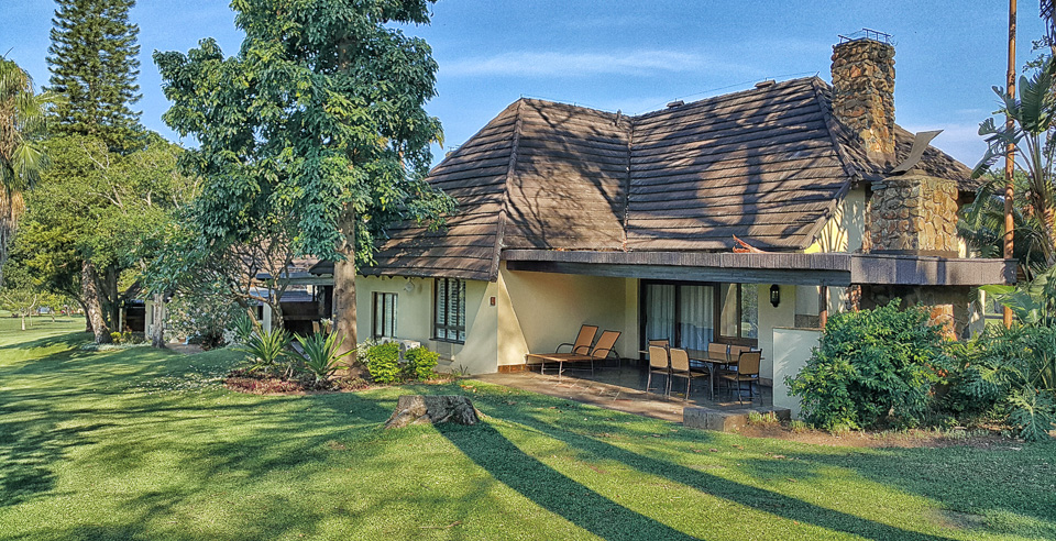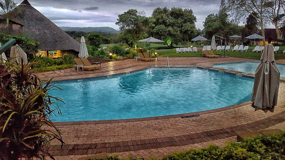 The view from the hotel looks onto the lush gardens with large trees that surround the hotel and chalets; the main swimming pool is right in front of the hotel and behind the golf house, from where you can see the many dams and the golf course.