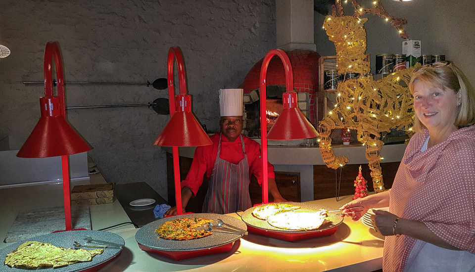 The cozy restaurant offers on-site dining or you can order room service, we had three wonderful dinners there. Each night they have a different buffet layout or you can order from the a la carte menu, but we would recommend the buffet; from salads, three different meats, curry of the day, soup and, last but not least, their deserts to die for.
