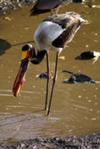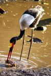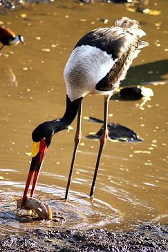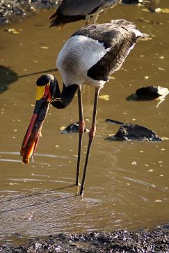 We came across a shrinking pool and there were several birds in attendance, including 2 Hammerkops, a Woolyneck Stork, a Grey Heron, 2 African Jacanas, several other smaller birds, and a female Saddlebilled Stork. We watched the Saddlebilled Stork for 35 minutes after she poked, proded, lifted, and dropped the Barbal at least 15 times, until she finally lined it up in her beak and swollowed it whole! This was absolutely the best bird sighting I have ever experienced.