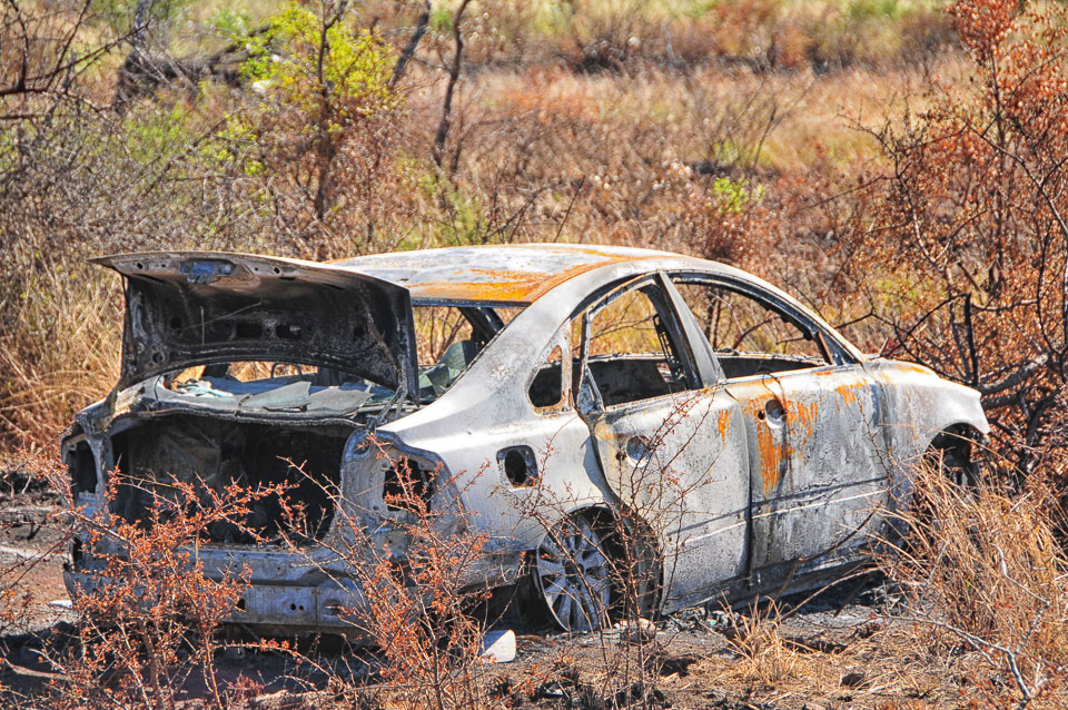 Burnt-out car on gravel road to Madikwe's Molatedi Gate.The speed limit on tarred roads in Namibia, South Africa and Botswana is 120 km per hour, however a speed of 100 km per hour is recommended until you are familiar with the tarred roads and local traffic conditions.