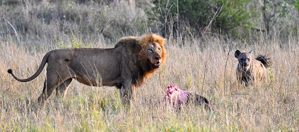 We started scanning and then saw the second, older male lion with a buffalo carcass!
