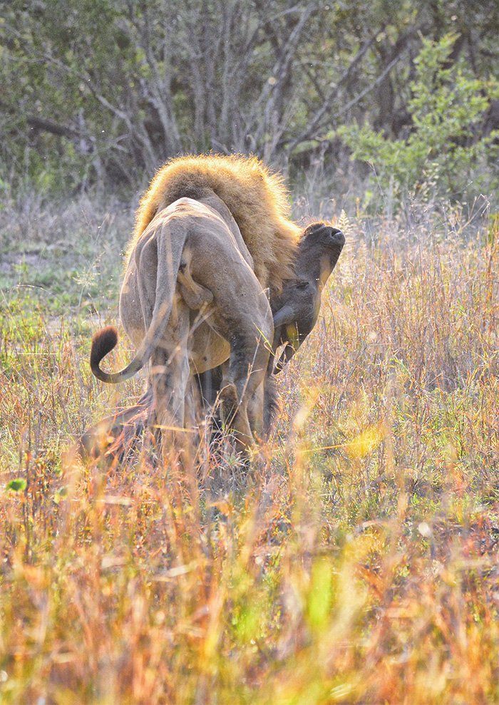 The male lion finally had enough and he dragged the carcass away and under a bush.